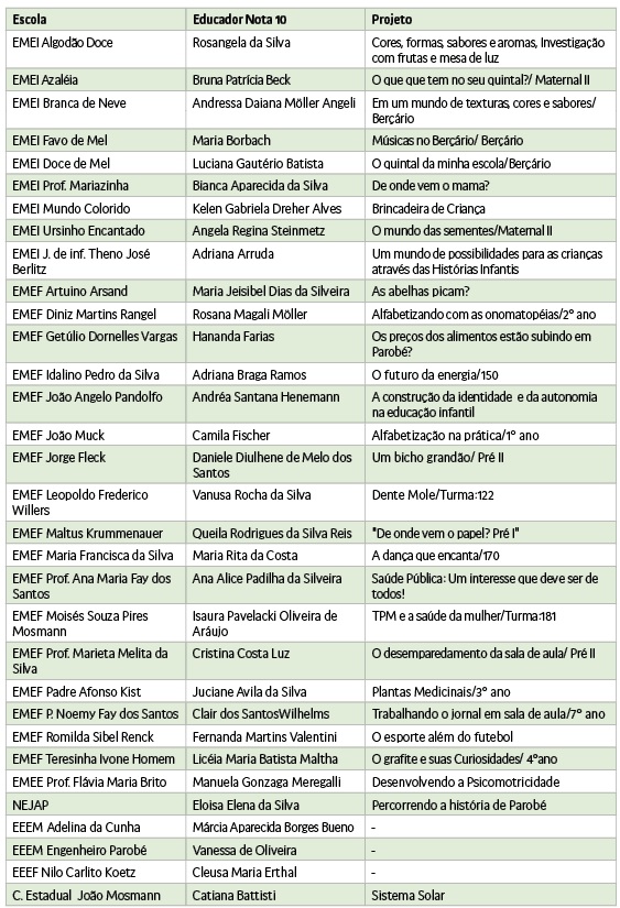 Confira a lista dos professores que foram premiados com a bolsa: Ana Alice Padilha da Silveira, da EMEF Ana Maria Fay dos Santos; Vanusa Rocha da Silva, da EMEF Leopoldo Frederico Willers; Luciana Gautério Batista, da EMEI Doce de Mel; Angela Regina, da EMEI Ursinha Encantado; Fernanda Valentini, da EMEF Romilda Sibel Renck; Rosângela da Silva, da EMEI Algodão Doce; Cristina Luz, da EMEF Marieta Melita; Daniele dos Santos, da EMEF Jorge Fleck; Clair Wilhelms, da EMEF Noemy Fay dos Santos; Adriana Arruda, da EMEI Theno José Berlitz.