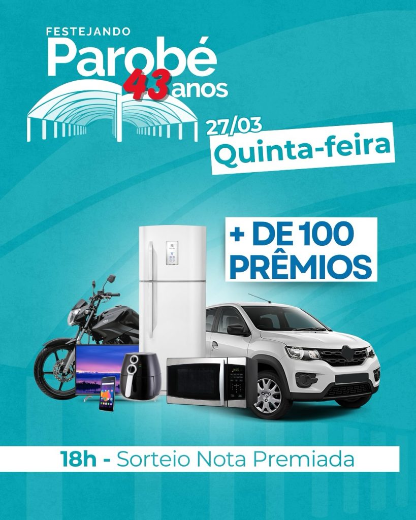 A programação desta quinta feira começa com uma atividade que promete sortear mais de uma centena de prêmios para os parobeenses que trocaram suas notas fiscais no programa Nota Premiada. O sorteio será realizado no Parque do Festejando às 18 horas de hoje, tendo como destaque um automóvel e uma motocicleta 0KM.