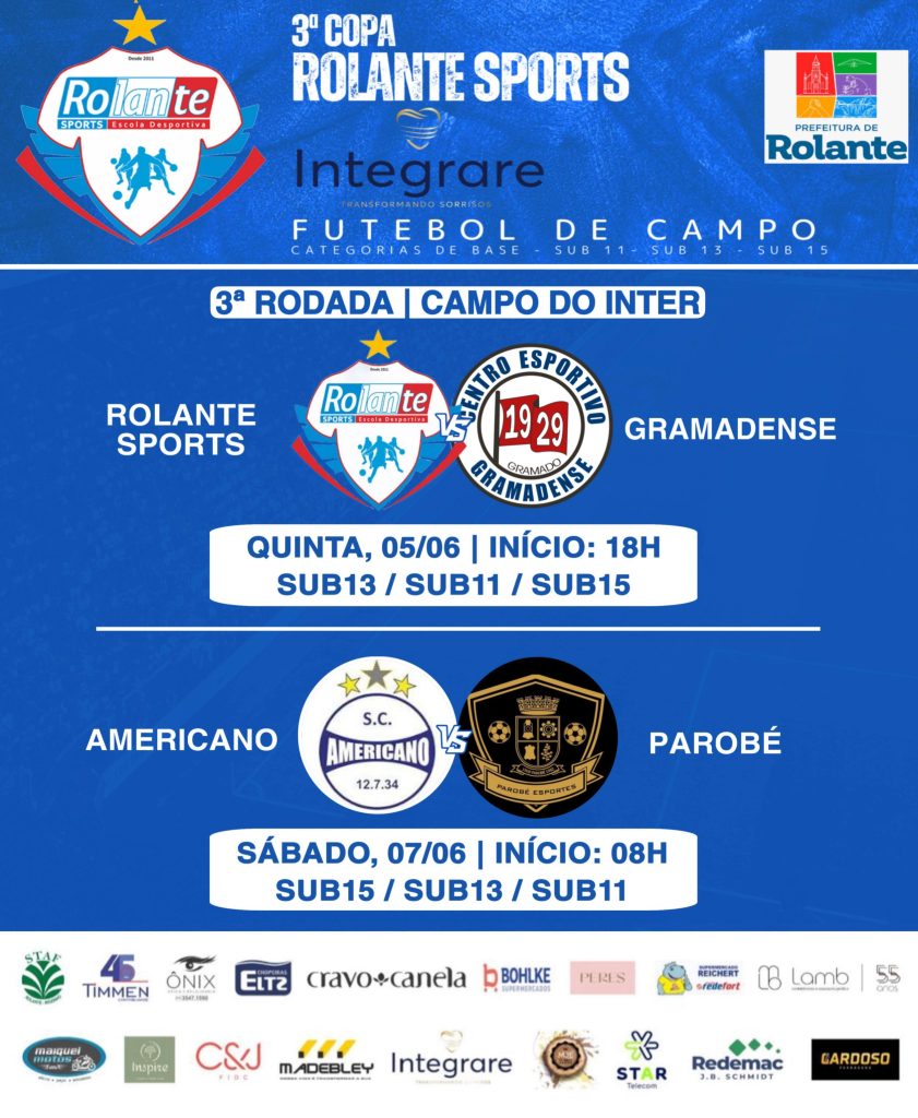 A Rolante Sports enfrentará o Gramadense pela 3ª Copa Rolante Sports Integrare de Futebol 2025 – Categorias de Base, nesta quinta-feira (5), no Campo do Internacional, nas categorias Sub 15, Sub 13 e Sub 11. Os jogos terão início às 18h, integrando a 3ª rodada do campeonato.