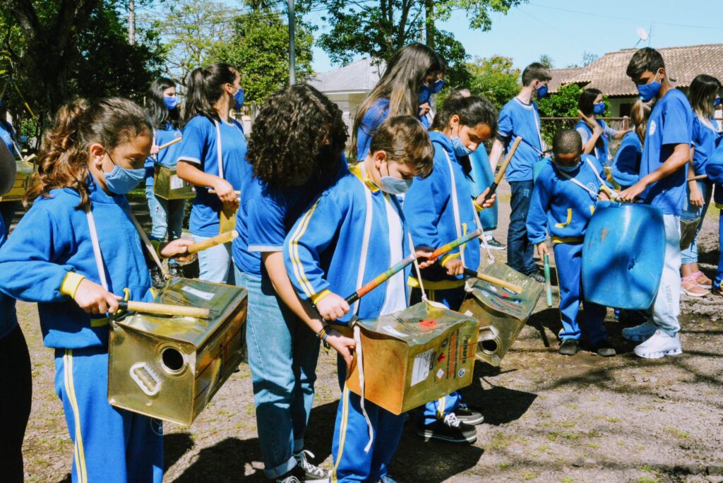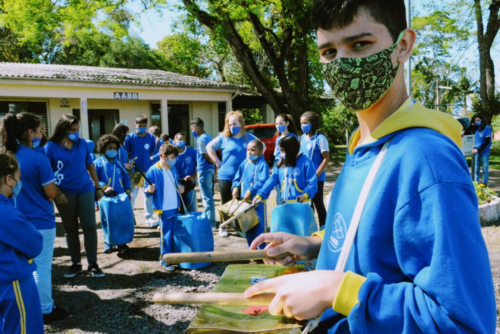 Na manhã desta terça-feira (5), alunos da AABB Comunidade receberam integrantes da Banda de Latas da Emel (Emef Emílio Leichtveis) onde participaram de uma oficina ministrada pelos estudantes da Banda. “Eu sempre gostei muito de música, tenho um tio que toca bateria e eu tocava sempre com ele, por isso achei muito legal esta oficina, pois podemos participar e aprender um pouco”, mencionou Yegor da Silva de Oliveira, 12 anos, aluno da EEEM Dirceu Marílio Martins e da AABB Comunidade.