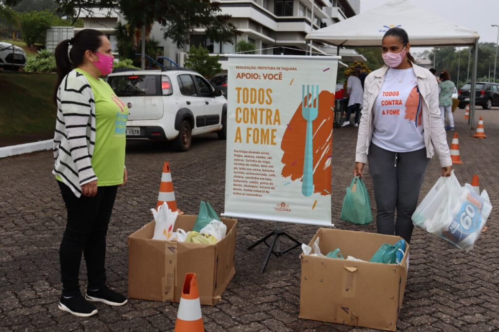Durante todos os dias de drive-thrus de vacinação, a equipe do Centro de Atendimento de Referência de Assistência Social (Cras) participa com a Campanha Todos Contra a Fome. A doação é espontânea, voluntária. Quem quiser colaborar pode doar alimentos não perecíveis, produtos de higiene pessoal e fralda infantil de todos os tamanhos. Os produtos são direcionados a famílias que passam por situações de vulnerabilidade em Taquara.