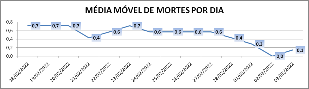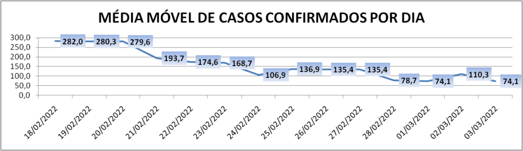 A média móvel de novos casos na região é de 74,1 por dia. Com relação ao índice de 14 dias atrás a média móvel apresenta queda de 74%*.