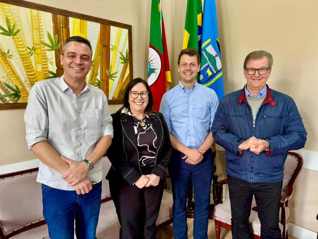 Secretário Douglas Kaiser (esq), juntamente com a prefeita Sirlei Silveira e o vice-prefeito Delmar Backes, receberam a visita de Thomas Fuhr no final de outubro (Cris Vargas/Prefeitura de Taquara)