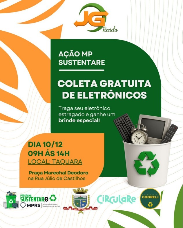 A Prefeitura de Taquara, em parceria com o Ministério Público do Rio Grande do Sul (MP-RS), por meio do programa Sustentare, realiza na próxima quarta-feira, dia 10 de dezembro, das 9h às 14h, uma ação especial de coleta gratuita de resíduos eletrônicos. A atividade acontecerá na Praça Marechal Deodoro, na Rua Júlio de Castilhos.
