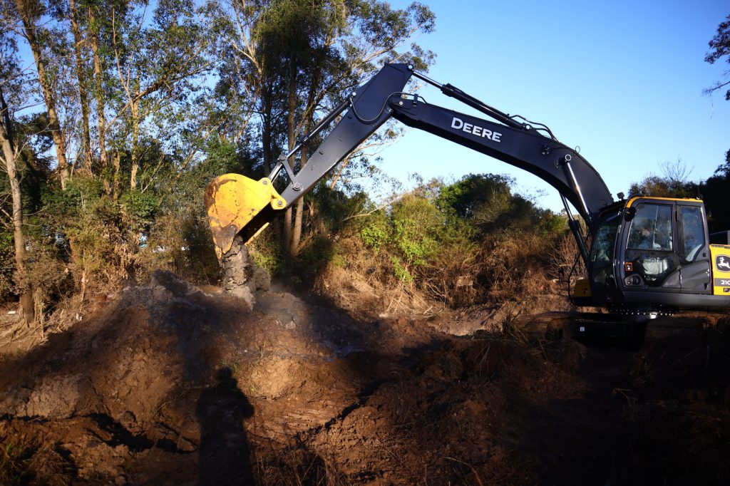 As primeiras ações começaram nesta terça-feira (02), com o desassoreamento do arroio Sonda, que deságua no Rio dos Sinos. Realizado pela Secretaria de Obras e Serviços, o trabalho de retirada de materiais do leito do córrego será executado ao longo das próximas duas semanas, com o uso de uma escavadeira.