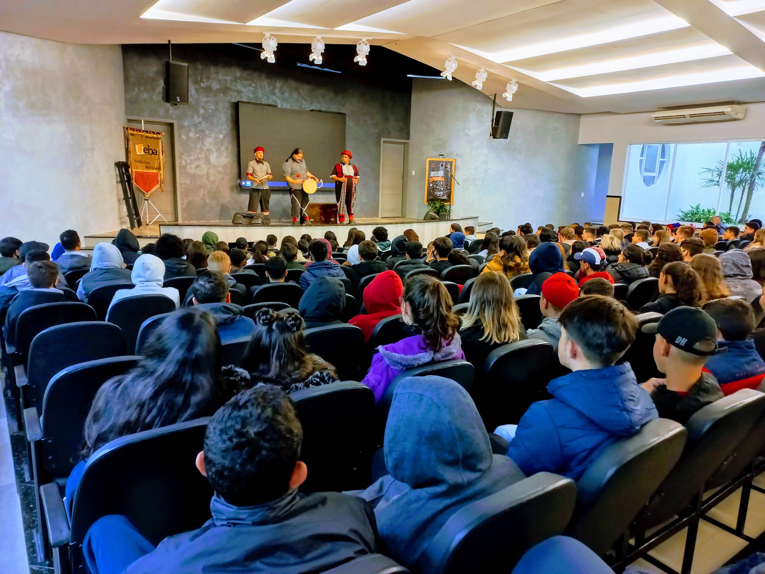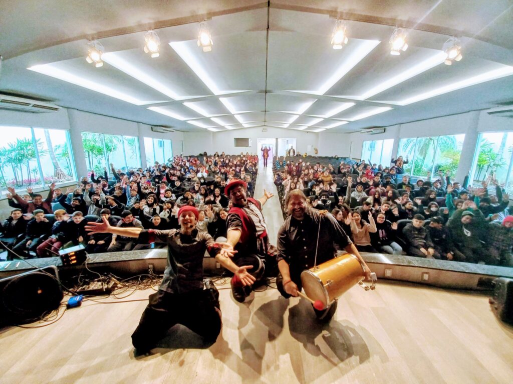 Mesmo com a baixa temperatura, a energia dos estudantes dos anos finais do Ensino Fundamental, que acompanharam o espetáculo teatral “Conto Contigo e Comigo”, com o grupo Ueba Produtos Notáveis, foi marcada por gargalhadas e aplausos.