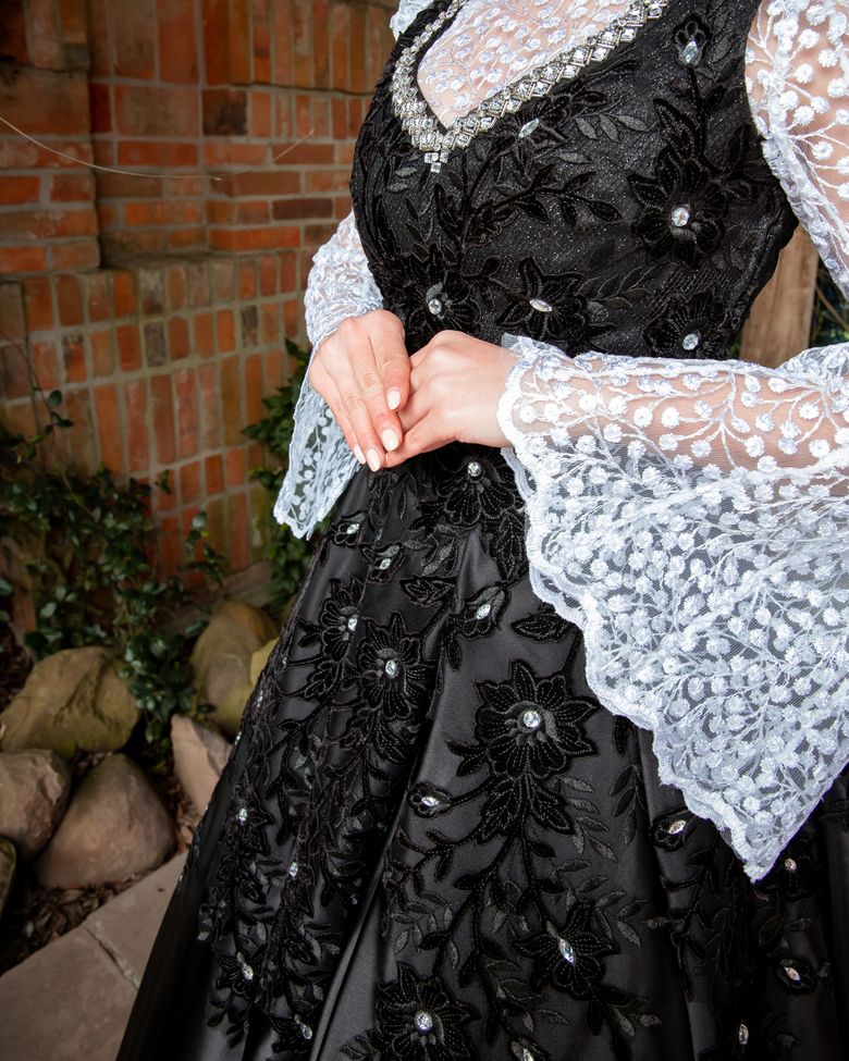 “As saias são amplas e nobres, enquanto a blusa off-white possui mangas de organza bufantes e decote com pequeno babado, algo bem característico alemão. A blusa branca é em renda e manga longa sino, enquanto uma blusa de renda preta completa a nobreza do conjunto”, acrescenta Wilney.
