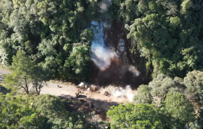 A Empresa Gaúcha de Rodovias (EGR) executou nesta segunda-feira (15/5), o desmonte de rochas por meio de detonação no talude localizado na altura do quilômetro 83, da ERS-020, em São Francisco de Paula. A rodovia teve o trânsito de veículos liberado, após as 17h45min, desta segunda.