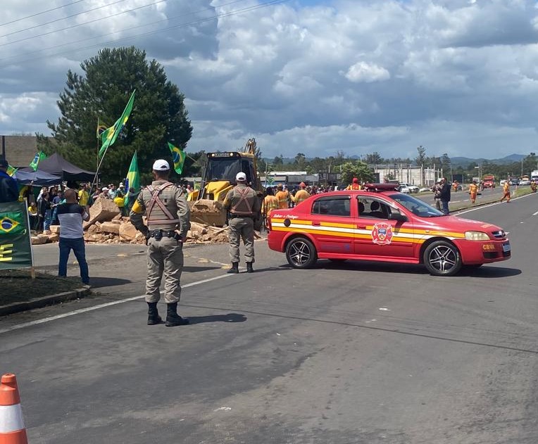Após a chegada da tropa de choque da Brigada Militar e de outras forças de segurança, como o Corpo de Bombeiros, os manifestantes que estão no Km 34 da rodovia estão liberando a passagem de veículos e removendo os materiais que bloqueavam os dois lados da rodovia.