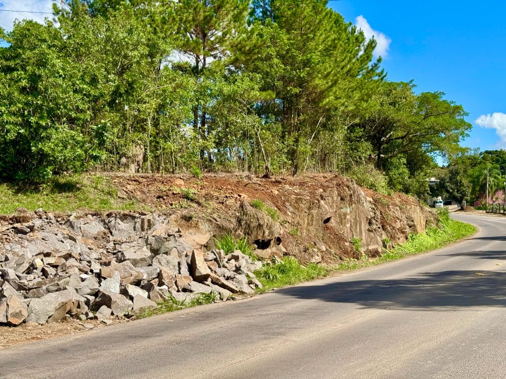 Será feita a detonação de uma rocha que obstrui a visão dos motoristas e compromete o acostamento da rodovia em Fazenda Fialho e dificulta acesso a escola Emel (Alan Jr Silva/Prefeitura de Taquara)