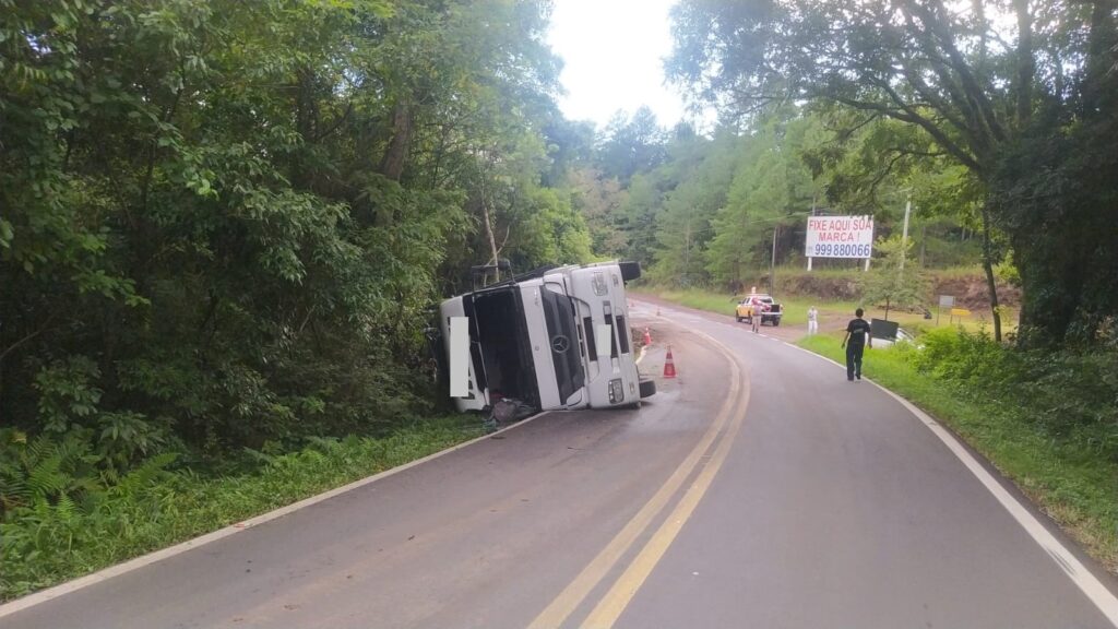 Trecho da ERS-020 é totalmente bloqueado para retirada do caminhão que tombou na ERS-020 em Três Coroas