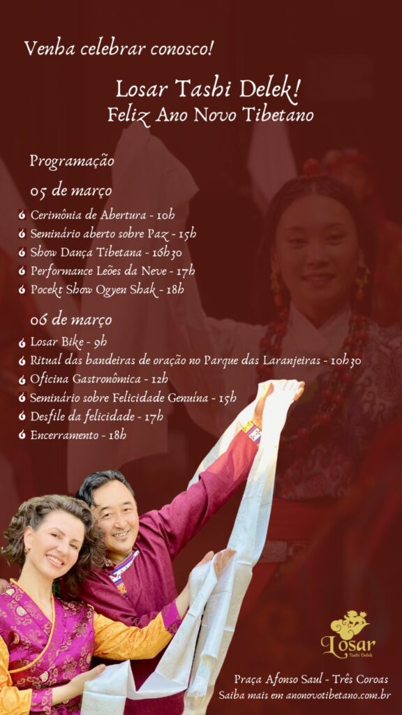 O evento ocorrerá mesmo com chuva, já que será na Rua Coberta. O Losar – ano novo tibetano tem realização da Shak Produções, apoio da Prefeitura Municipal de Três Coroas e Espaço Tibet. Mais informações: www.anonovotibetano.com.br