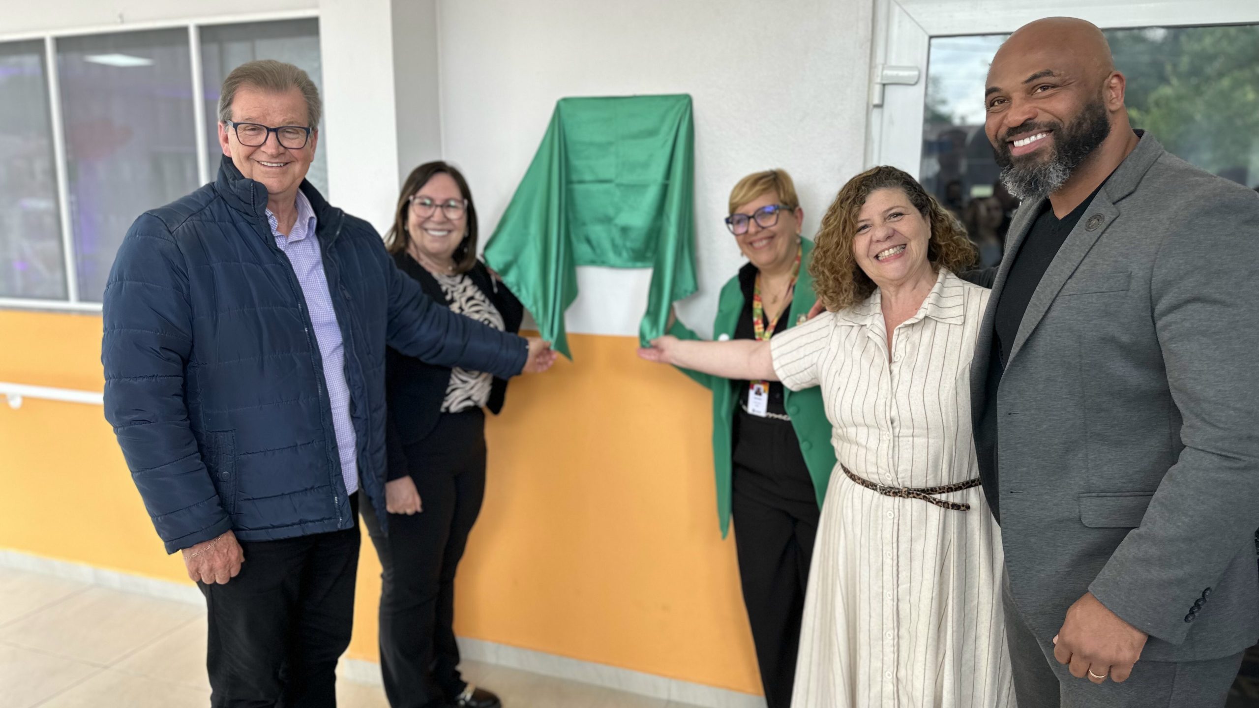 Autoridades no descerramento da placa simbólica de entrega – Crédito: Guilherme Kaiser / Rádio Taquara