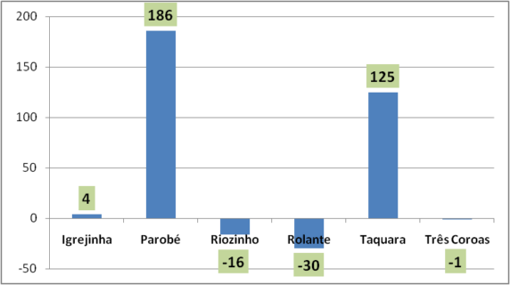 Fazendo a análise do ranking regional durante todos os meses do ano(tabela abaixo), a liderança na geração de empregos formais é de Taquara. Depois, aparece Igrejinha, seguido de Rolante, Três Coroas, Parobé e Riozinho.