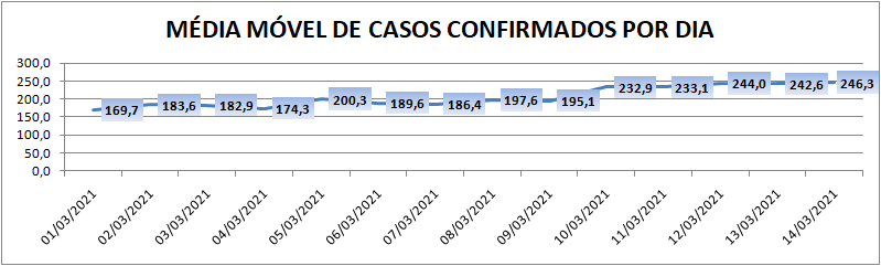 O Vale do Paranhana registrou, neste domingo (14), a maior média móvel de casos novos de infecção pelo coronavírus desde o início da pandemia. É um recorde que vem sendo batido semana a semana, e a última foi a que mais intensificou este crescimento. O índice atual é de 246,3 novos casos de infecção por dia; a média móvel de óbitos na região está em seis registros diários, mas o dado deste domingo não é o maior da pandemia. O registro mais alto de óbitos foi na quarta-feira passada, dia 10 de março, quando o indicador esteve em 6,7.