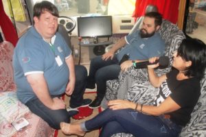 Durante a transmissão ao vivo, o jornalista Vinicius Linden entrevista o vice-prefeito de Taquara, Hélio Cardoso Neto. Vinicius Linden entrevista o vereador Dari da Silva, de Parobé. Público prestigia as atrações musicais da festa. Serviços de maquiagem foram oferecidos pelo Senac. Crianças tiveram ações de recreação com o Sesc. Guido Mário Prass Filho, vereador de Taquara; Dari da Silva, vereador de Parobé; e Neimar Parreira, vereador de Igrejinha. Cléber Bender, comunicador da Rádio Taquara, comanda sorteio de brindes. Vinicius Linden e Josué Ferreira, da Rádio Taquara, durante a entrevista com Tatiana da Rosa, sobre as ações da Secretaria de Saúde. Entrevista ao vivo com a vice-prefeita de Parobé, Marizete Pinheiro. Comunidade prestigiou em família o aniversário da Rádio Taquara. Entrevista com Charles, vocalista do Musical RC. Sérgio Gabriel falou à Rádio Taquara sobre a carreira. Entrevista com o vereador de Taquara Adalberto Soares. Sérgio Gabriel foi cantar junto com o público. Gilson e Gabriel comandaram o terceiro show da tarde do sábado. Gabriel animou a plateia. Gilson e Gabriel resgataram clássicos sertanejos em sua apresentação. Público dançou animando pela dupla sertaneja. Cris Fagundes encerrou os shows na Festa da Rádio Taquara. Sucessos sertanejos “pra cima” embalaram o repertório do músico que tem base no Vale do Sinos. Vencedores do vale brinde de R$ 250,00 em compras do Rissul. Inge Dienstmann, da Rádio Taquara, com os ganhadores do vale-brinde de R$ 250,00 em compras no Rissul. Inge Dienstmann, da Rádio Taquara, com a ganhadora da bicicleta sorteada pela emissora. Olavo Wagner, diretor da Rádio Taquara, e o comunicador Alan Júnior no agradecimento à presença do público. Alan Júnior faz entrevista com o público presente. Musical RC animou o segundo show da tarde. Comunidade prestigiou o aniversário de 68 anos da Rádio Taquara. Público levou cadeiras para melhor se acomodar e acompanhar os shows. Musical RC animou o baile. Apresentação do Musical RC.