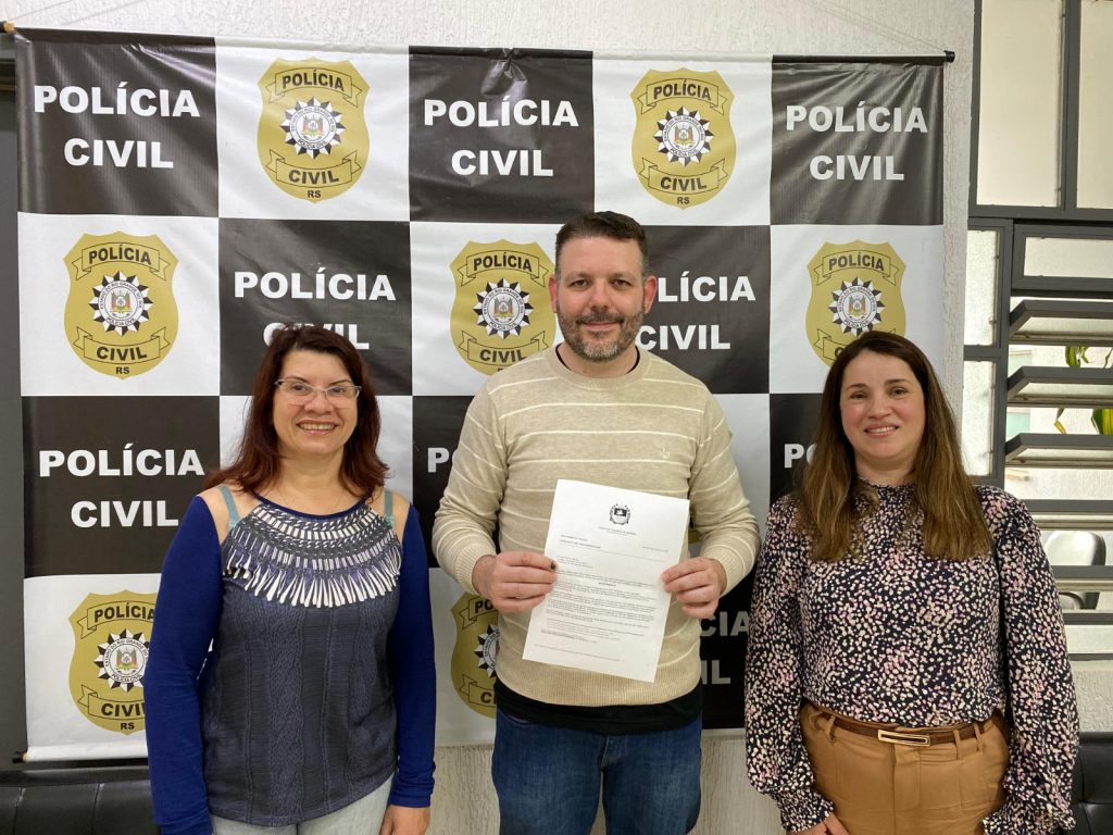 Vereadora Professora Neidi e a primeira-dama de Igrejinha, Carla Horlle, foram recebidas pelo delegado Fábio Peres (Divulgação)