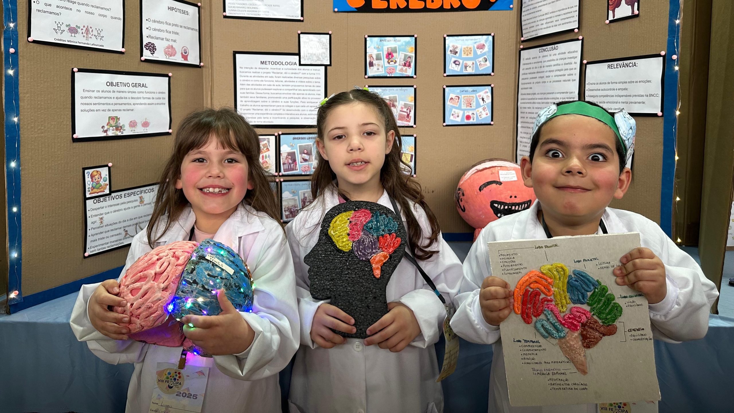 Um trio de pequenos explica o trabalho Reclamar, dói o cérebro?, vestidos de cientistas. “Um dia eu estava na sala e reclamei de uma atividade. A prof. disse: ‘Não reclame! Sabia que reclamar dói o cérebro?’. Esse é o problema do nosso projeto“, conta Lunna Celeste, de apenas 6 anos.